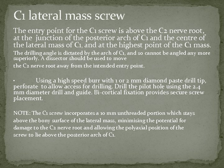 C 1 lateral mass screw The entry point for the C 1 screw is above the C 2 nerve root, at the junction of the posterior arch of C 1 and the centre of the lateral mass of C 1, and at the highest point of the C 1 mass. The drilling angle is dictated by the arch of C 1, and so cannot be angled any more superiorly. A dissector should be used to move the C 2 nerve root away from the intended entry point. Using a high speed burr with 1 or 2 mm diamond paste drill tip, perforate to allow access for drilling. Drill the pilot hole using the 2. 4 mm diameter drill and guide. Bi-cortical fixation provides secure screw placement. • NOTE: The C 1 screw incorporates a 10 mm unthreaded portion which stays above the bony surface of the lateral mass, minimising the potential for damage to the C 2 nerve root and allowing the polyaxial position of the screw to lie above the posterior arch of C 1.