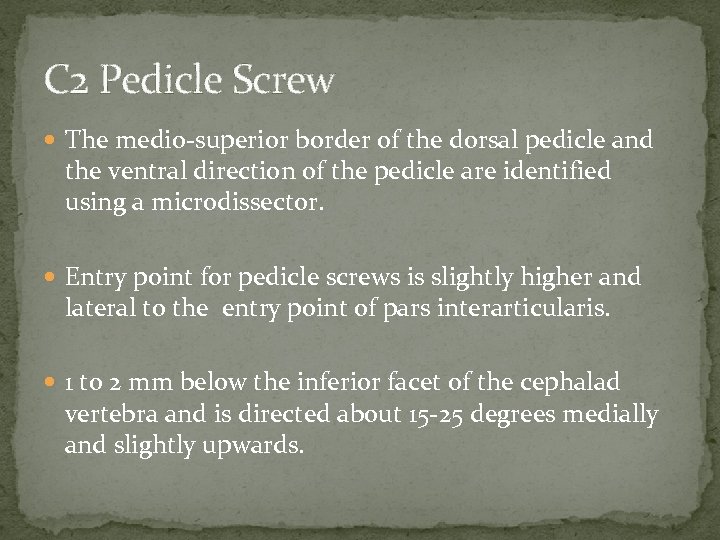 C 2 Pedicle Screw The medio-superior border of the dorsal pedicle and the ventral direction of the pedicle are identified using a microdissector. Entry point for pedicle screws is slightly higher and lateral to the entry point of pars interarticularis. 1 to 2 mm below the inferior facet of the cephalad vertebra and is directed about 15 -25 degrees medially and slightly upwards.