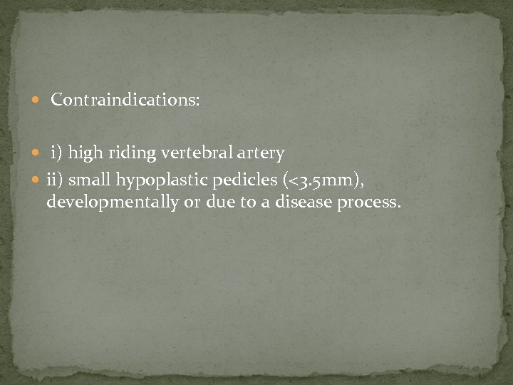 Contraindications: i) high riding vertebral artery ii) small hypoplastic pedicles (<3. 5 mm), developmentally or due to a disease process.