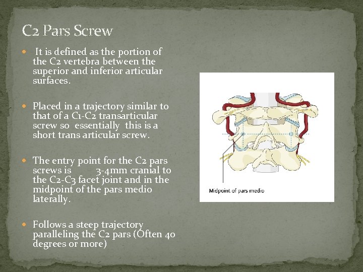 C 2 Pars Screw It is defined as the portion of the C 2 vertebra between the superior and inferior articular surfaces. Placed in a trajectory similar to that of a C 1 -C 2 transarticular screw so essentially this is a short trans articular screw. The entry point for the C 2 pars screws is 3 -4 mm cranial to the C 2 -C 3 facet joint and in the midpoint of the pars medio laterally. Follows a steep trajectory paralleling the C 2 pars (Often 40 degrees or more)
