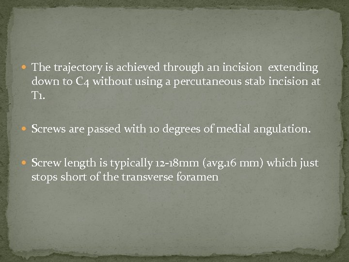 The trajectory is achieved through an incision extending down to C 4 without using a percutaneous stab incision at T 1. Screws are passed with 10 degrees of medial angulation. Screw length is typically 12 -18 mm (avg. 16 mm) which just stops short of the transverse foramen