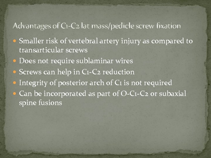 Advantages of C 1 -C 2 lat mass/pedicle screw fixation Smaller risk of vertebral artery injury as compared to transarticular screws Does not require sublaminar wires Screws can help in C 1 -C 2 reduction Integrity of posterior arch of C 1 is not required Can be incorporated as part of O-C 1 -C 2 or subaxial spine fusions