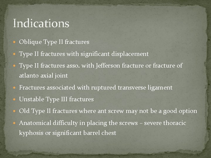 Indications Oblique Type II fractures with significant displacement Type II fractures asso. with Jefferson fracture or fracture of atlanto axial joint Fractures associated with ruptured transverse ligament Unstable Type III fractures Old Type II fractures where ant screw may not be a good option Anatomical difficulty in placing the screws – severe thoracic kyphosis or significant barrel chest