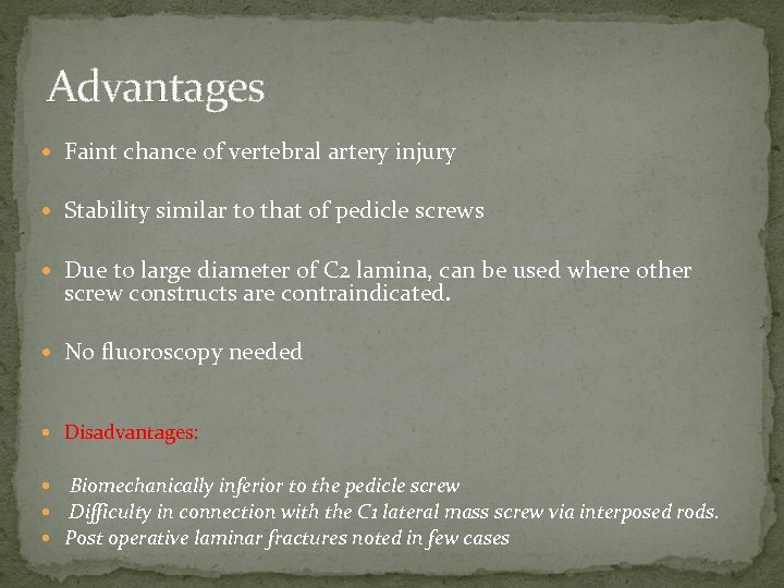 Advantages Faint chance of vertebral artery injury Stability similar to that of pedicle screws Due to large diameter of C 2 lamina, can be used where other screw constructs are contraindicated. No fluoroscopy needed Disadvantages: Biomechanically inferior to the pedicle screw Difficulty in connection with the C 1 lateral mass screw via interposed rods. Post operative laminar fractures noted in few cases