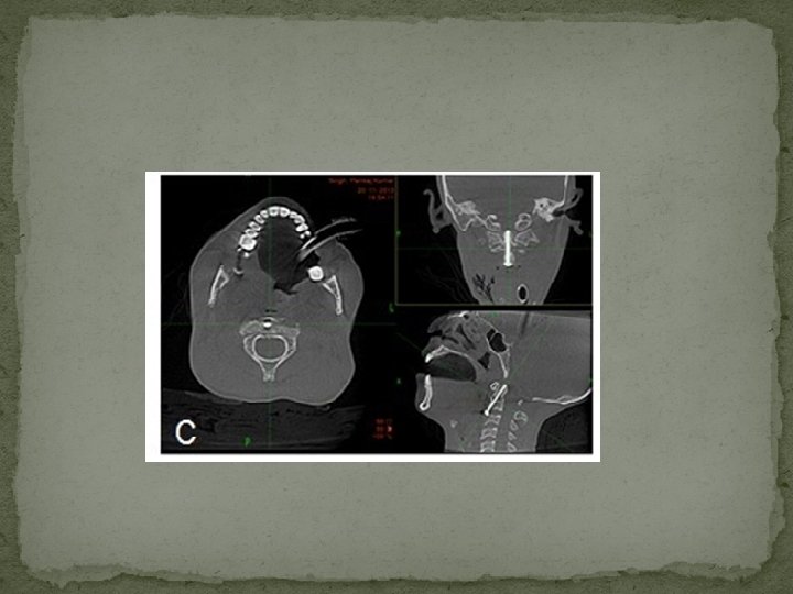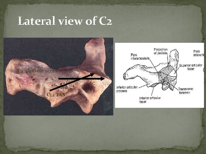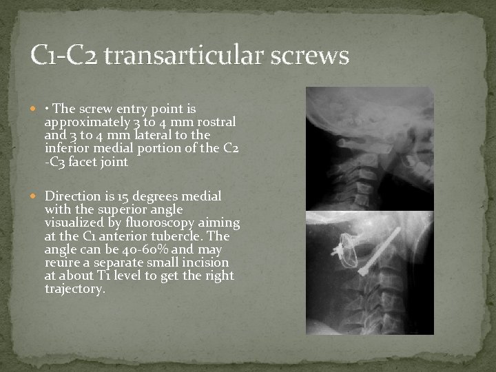 C 1 -C 2 transarticular screws • The screw entry point is approximately 3 to 4 mm rostral and 3 to 4 mm lateral to the inferior medial portion of the C 2 -C 3 facet joint Direction is 15 degrees medial with the superior angle visualized by fluoroscopy aiming at the C 1 anterior tubercle. The angle can be 40 -60% and may reuire a separate small incision at about T 1 level to get the right trajectory.
