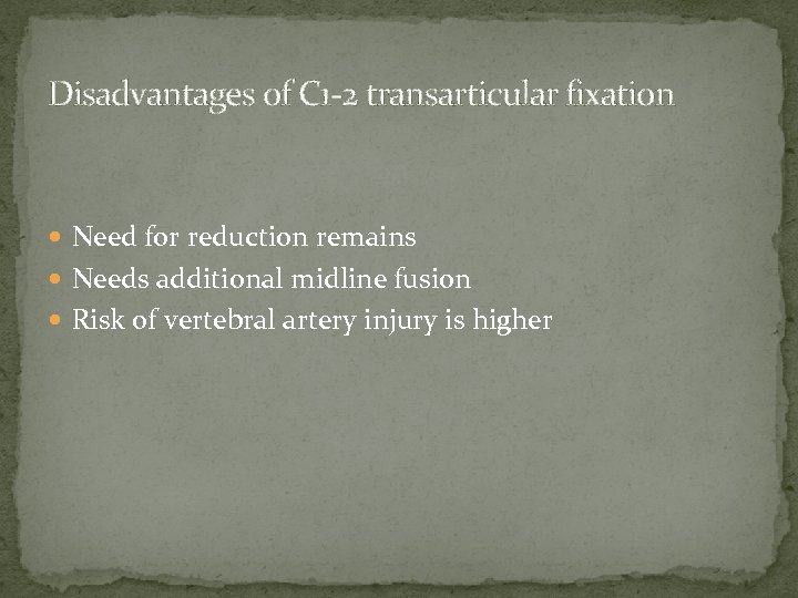 Disadvantages of C 1 -2 transarticular fixation Need for reduction remains Needs additional midline fusion Risk of vertebral artery injury is higher