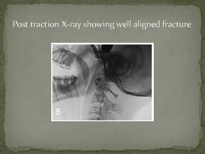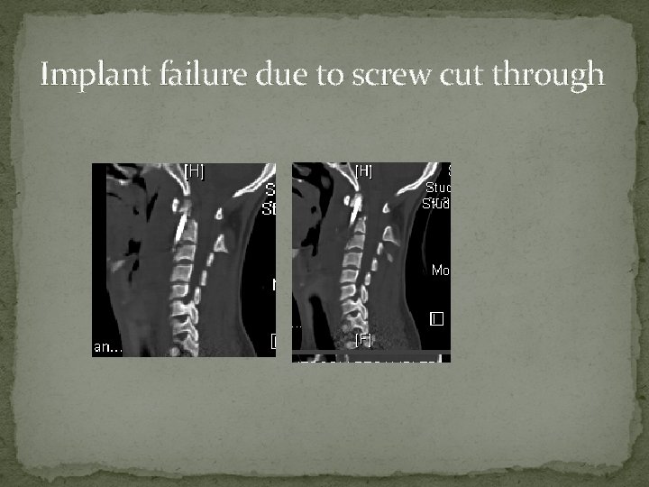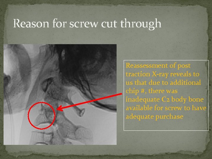 Reason for screw cut through Reassessment of post traction X-ray reveals to us that due to additional chip #, there was inadequate C 2 body bone available for screw to have adequate purchase