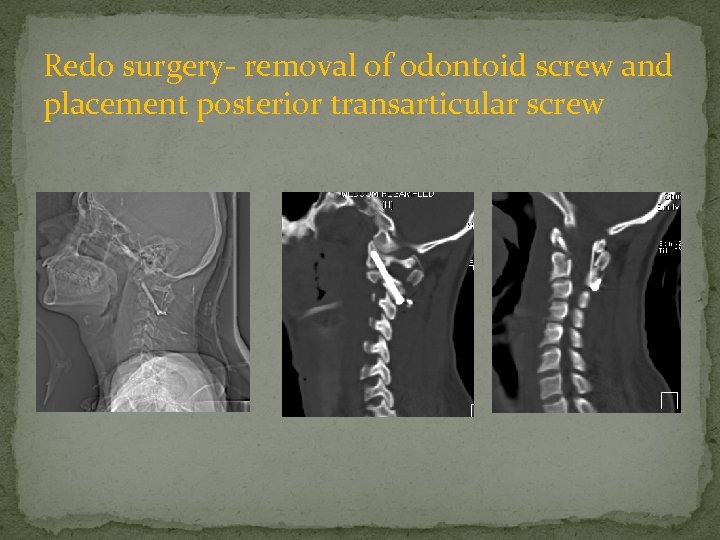Redo surgery- removal of odontoid screw and placement posterior transarticular screw