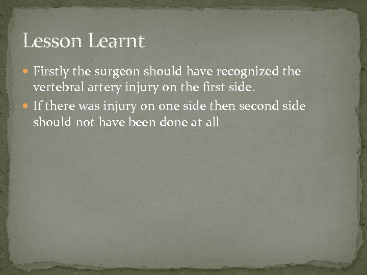Lesson Learnt Firstly the surgeon should have recognized the vertebral artery injury on the first side. If there was injury on one side then second side should not have been done at all