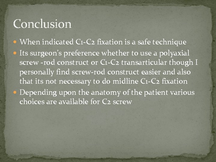 Conclusion When indicated C 1 -C 2 fixation is a safe technique Its surgeon’s preference whether to use a polyaxial screw -rod construct or C 1 -C 2 transarticular though I personally find screw-rod construct easier and also that its not necessary to do midline C 1 -C 2 fixation Depending upon the anatomy of the patient various choices are available for C 2 screw