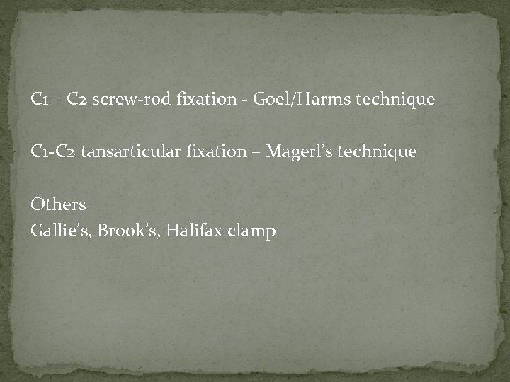 C 1 – C 2 screw-rod fixation - Goel/Harms technique C 1 -C 2 tansarticular fixation – Magerl’s technique Others Gallie’s, Brook’s, Halifax clamp
