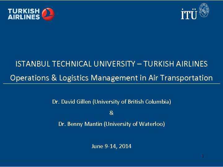 ISTANBUL TECHNICAL UNIVERSITY – TURKISH AIRLINES Operations & Logistics Management in Air Transportation Dr. David Gillen (University of British Columbia) & Dr. Benny Mantin (University of Waterloo) June 9 -14, 2014 1