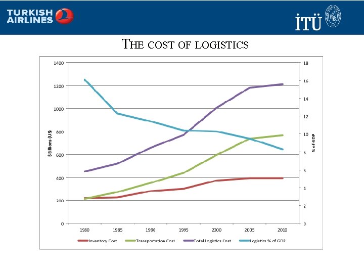U. S. LOGISTICS COST, 1980 -2010 IN FIVE YEAR INTERVALSB) ($ Year Nominal GDP ($T) Inventory Transportation Cost Administrative Cost Total Logistics Cost Logistics % of GDP 1980 220 214 17 451 16. 1 1985 4. 22 227 274 20 521 12. 3 1990 5. 80 283 351 25 659 11. 4 1995 7. 40 302 441 30 773 10. 4 2000 9. 82 374 594 39 1007 10. 3 2005 12. 43 395 739 46 1180 9. 5 2010 14. 60 396 769 47 1212 8. 3