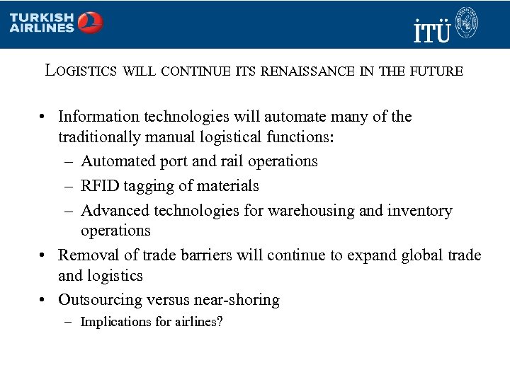 LOGISTICS WILL CONTINUE ITS RENAISSANCE IN THE FUTURE • Information technologies will automate many of the traditionally manual logistical functions: – Automated port and rail operations – RFID tagging of materials – Advanced technologies for warehousing and inventory operations • Removal of trade barriers will continue to expand global trade and logistics • Outsourcing versus near-shoring – Implications for airlines?