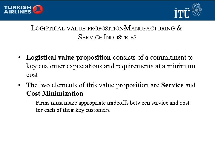 LOGISTICAL VALUE PROPOSITION- ANUFACTURING & M SERVICE INDUSTRIES • Logistical value proposition consists of a commitment to key customer expectations and requirements at a minimum cost • The two elements of this value proposition are Service and Cost Minimization – Firms must make appropriate tradeoffs between service and cost for each of their key customers
