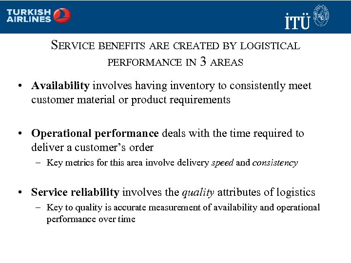SERVICE BENEFITS ARE CREATED BY LOGISTICAL PERFORMANCE IN 3 AREAS • Availability involves having inventory to consistently meet customer material or product requirements • Operational performance deals with the time required to deliver a customer’s order – Key metrics for this area involve delivery speed and consistency • Service reliability involves the quality attributes of logistics – Key to quality is accurate measurement of availability and operational performance over time