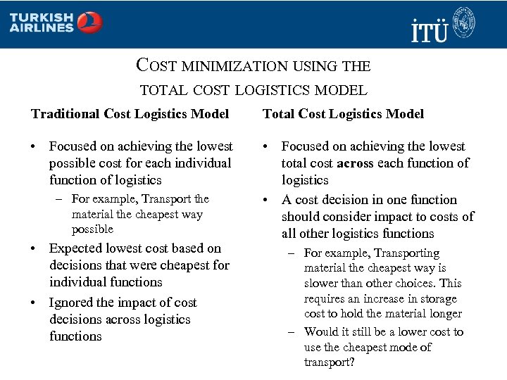 COST MINIMIZATION USING THE TOTAL COST LOGISTICS MODEL Traditional Cost Logistics Model Total Cost Logistics Model • Focused on achieving the lowest possible cost for each individual function of logistics • Focused on achieving the lowest total cost across each function of logistics • A cost decision in one function should consider impact to costs of all other logistics functions – For example, Transport the material the cheapest way possible • Expected lowest cost based on decisions that were cheapest for individual functions • Ignored the impact of cost decisions across logistics functions – For example, Transporting material the cheapest way is slower than other choices. This requires an increase in storage cost to hold the material longer – Would it still be a lower cost to use the cheapest mode of transport?
