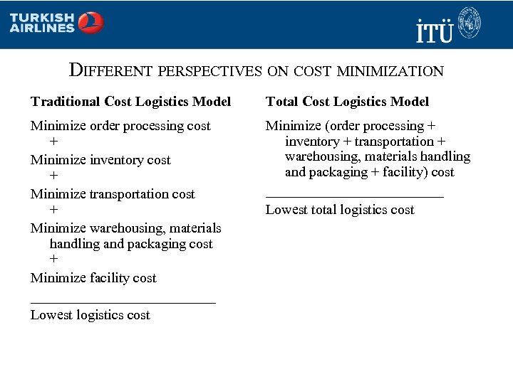 DIFFERENT PERSPECTIVES ON COST MINIMIZATION Traditional Cost Logistics Model Total Cost Logistics Model Minimize order processing cost + Minimize inventory cost + Minimize transportation cost + Minimize warehousing, materials handling and packaging cost + Minimize facility cost _____________ Lowest logistics cost Minimize (order processing + inventory + transportation + warehousing, materials handling and packaging + facility) cost _____________ Lowest total logistics cost