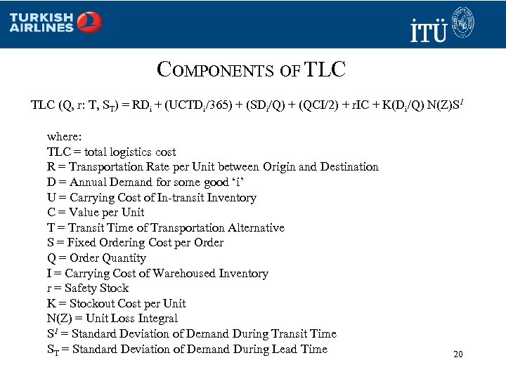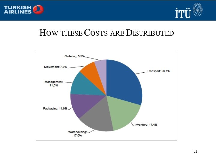 COMPONENTS OF TLC (Q, r: T, ST) = RDi + (UCTDi/365) + (SDi/Q) + (QCI/2) + r. IC + K(Di/Q) N(Z)S 1 where: TLC = total logistics cost R = Transportation Rate per Unit between Origin and Destination D = Annual Demand for some good ‘i’ U = Carrying Cost of In-transit Inventory C = Value per Unit T = Transit Time of Transportation Alternative S = Fixed Ordering Cost per Order Q = Order Quantity I = Carrying Cost of Warehoused Inventory r = Safety Stock K = Stockout Cost per Unit N(Z) = Unit Loss Integral S 1 = Standard Deviation of Demand During Transit Time ST = Standard Deviation of Demand During Lead Time 20