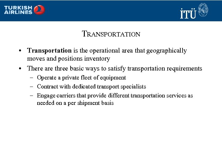 TRANSPORTATION • Transportation is the operational area that geographically moves and positions inventory • There are three basic ways to satisfy transportation requirements – Operate a private fleet of equipment – Contract with dedicated transport specialists – Engage carriers that provide different transportation services as needed on a per shipment basis