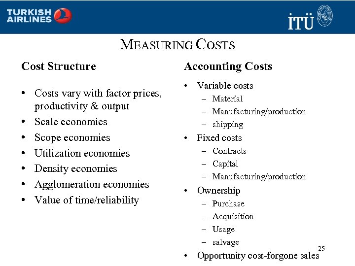 MEASURING COSTS Cost Structure • Costs vary with factor prices, productivity & output • Scale economies • Scope economies • Utilization economies • Density economies • Agglomeration economies • Value of time/reliability Accounting Costs • Variable costs – Material – Manufacturing/production – shipping • Fixed costs – Contracts – Capital – Manufacturing/production • Ownership – – Purchase Acquisition Usage salvage 25 • Opportunity cost-forgone sales