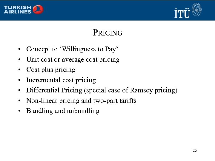 PRICING • • Concept to ‘Willingness to Pay’ Unit cost or average cost pricing Cost plus pricing Incremental cost pricing Differential Pricing (special case of Ramsey pricing) Non-linear pricing and two-part tariffs Bundling and unbundling 26