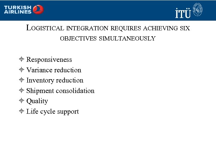 LOGISTICAL INTEGRATION REQUIRES ACHIEVING SIX OBJECTIVES SIMULTANEOUSLY ± Responsiveness ± Variance reduction ± Inventory reduction ± Shipment consolidation ± Quality ± Life cycle support