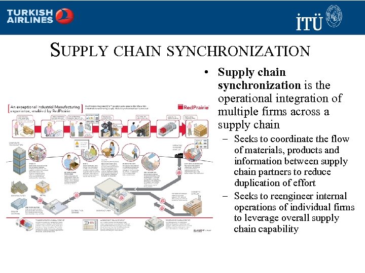 SUPPLY CHAIN SYNCHRONIZATION • Supply chain synchronization is the operational integration of multiple firms across a supply chain – Seeks to coordinate the flow of materials, products and information between supply chain partners to reduce duplication of effort – Seeks to reengineer internal operations of individual firms to leverage overall supply chain capability