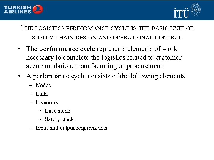 THE LOGISTICS PERFORMANCE CYCLE IS THE BASIC UNIT OF SUPPLY CHAIN DESIGN AND OPERATIONAL CONTROL • The performance cycle represents elements of work necessary to complete the logistics related to customer accommodation, manufacturing or procurement • A performance cycle consists of the following elements – Nodes – Links – Inventory • Base stock • Safety stock – Input and output requirements