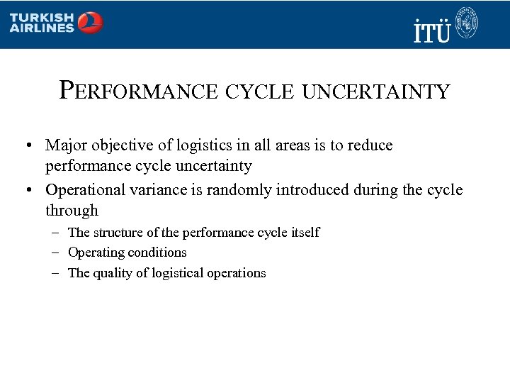 PERFORMANCE CYCLE UNCERTAINTY • Major objective of logistics in all areas is to reduce performance cycle uncertainty • Operational variance is randomly introduced during the cycle through – The structure of the performance cycle itself – Operating conditions – The quality of logistical operations