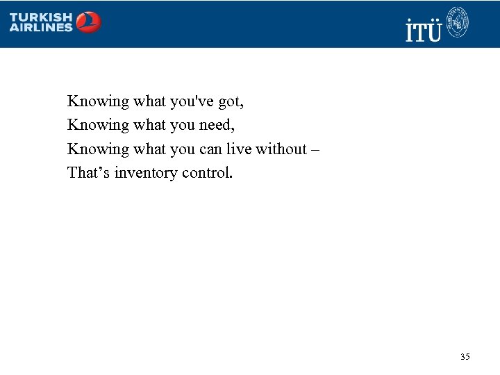 Knowing what you've got, Knowing what you need, Knowing what you can live without – That’s inventory control. Frank Wheeler, Revolutionary 35