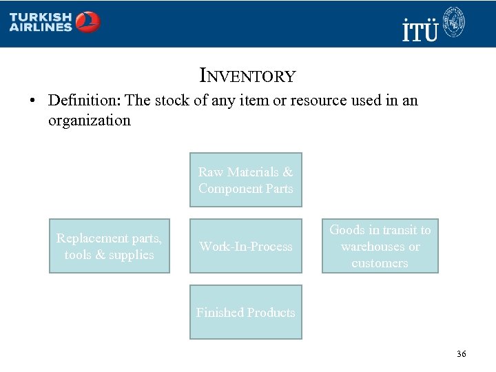 INVENTORY • Definition: The stock of any item or resource used in an organization Raw Materials & Component Parts Replacement parts, tools & supplies Work-In-Process Goods in transit to warehouses or customers Finished Products 36