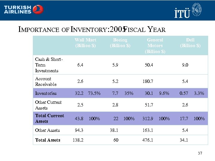 IMPORTANCE OF INVENTORY: 2005 ISCAL YEAR F Wall Mart (Billion $) Boeing (Billion $) General Motors (Billion $) Dell (Billion $) Cash & Short. Term Investments 6. 4 5. 9 50. 4 9. 0 Account Receivable 2. 6 5. 2 180. 7 5. 4 Inventories 32. 2 73. 5% 7. 7 35% 30. 1 9. 6% 0. 57 Other Current Assets 2. 5 Total Current Assets 43. 8 Other Assets 94. 3 38. 1 163. 1 5. 4 Total Assets 138. 2 60 476. 1 3. 3% 34. 1 2. 8 100% 22 51. 7 100% 312. 9 2. 6 100% 17. 7 100% 37