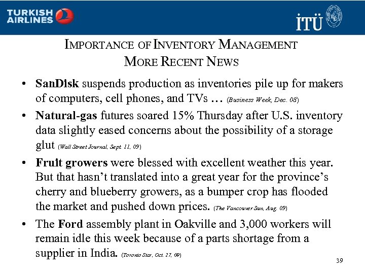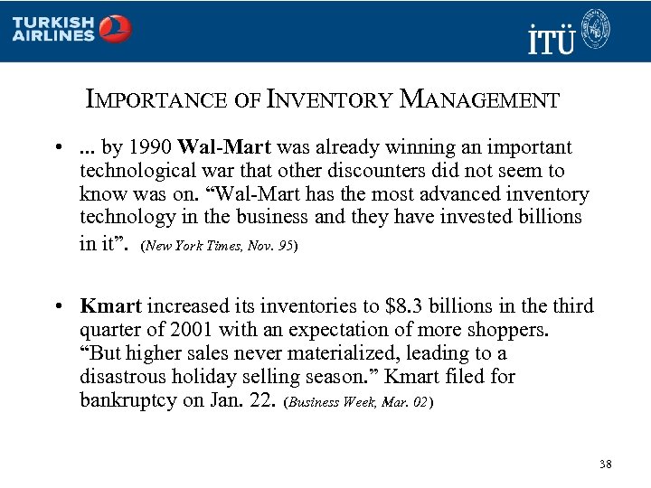 IMPORTANCE OF INVENTORY MANAGEMENT • . . . by 1990 Wal-Mart was already winning an important technological war that other discounters did not seem to know was on. “Wal-Mart has the most advanced inventory technology in the business and they have invested billions in it”. (New York Times, Nov. 95) • Kmart increased its inventories to $8. 3 billions in the third quarter of 2001 with an expectation of more shoppers. “But higher sales never materialized, leading to a disastrous holiday selling season. ” Kmart filed for bankruptcy on Jan. 22. (Business Week, Mar. 02) 38