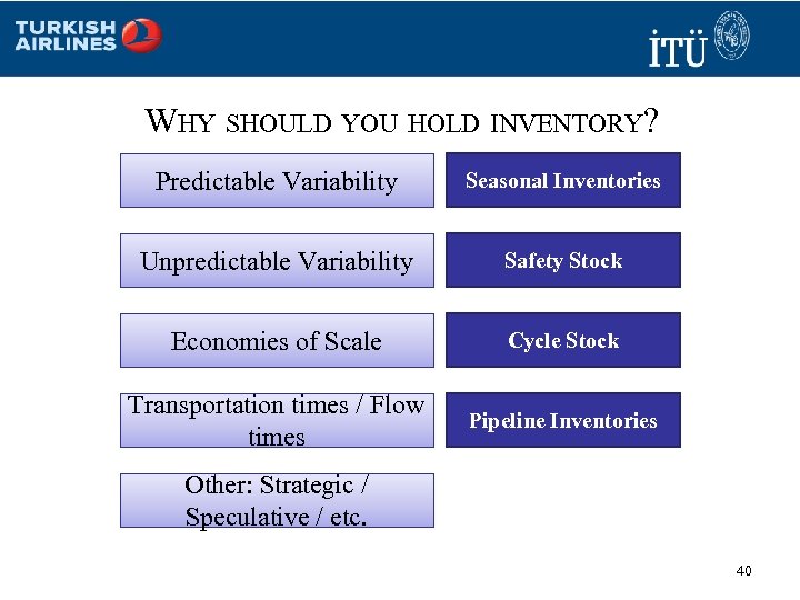 WHY SHOULD YOU HOLD INVENTORY? Predictable Variability Seasonal Inventories What are some of the inventories Safety Stock Unpredictable Variability that you have? Economies of Scale Cycle Stock Transportation times you have these Why do / Flow Pipeline Inventories times inventories? Other: Strategic / Speculative / etc. 40