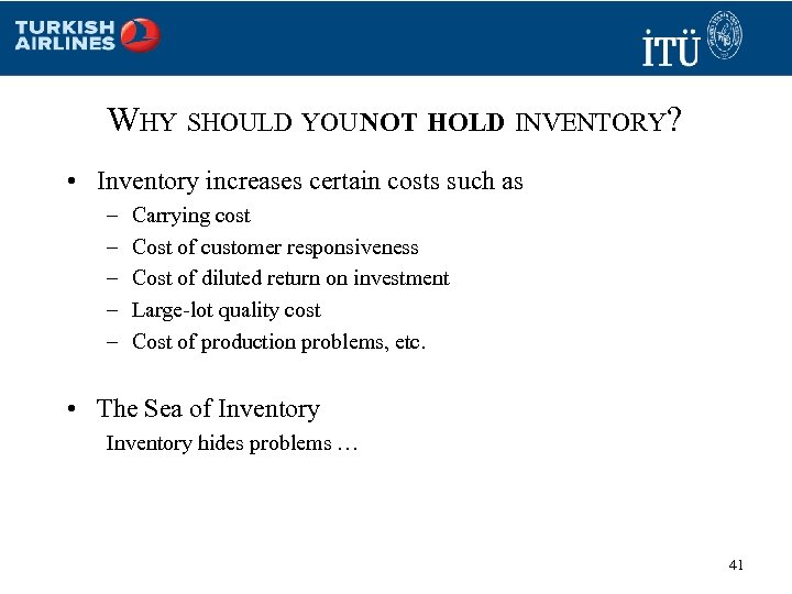 WHY SHOULD YOU NOT HOLD INVENTORY? • Inventory increases certain costs such as – – – Carrying cost Cost of customer responsiveness Cost of diluted return on investment Large-lot quality cost Cost of production problems, etc. • The Sea of Inventory hides problems … 41