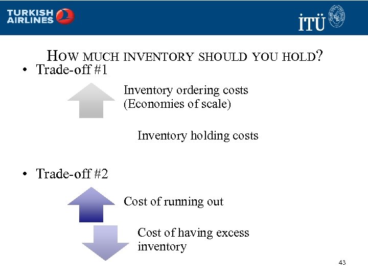 HOW MUCH INVENTORY SHOULD YOU HOLD? • Trade-off #1 Inventory ordering costs (Economies of scale) Inventory holding costs • Trade-off #2 Cost of running out Cost of having excess inventory 43
