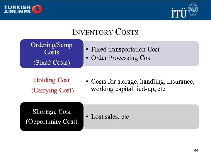 INVENTORY COSTS Ordering/Setup Costs (Fixed Costs) • Fixed transportation Cost • Order Processing Cost Holding Cost (Carrying Cost) • Costs for storage, handling, insurance, working capital tied-up, etc Shortage Cost (Opportunity Cost) • Lost sales, etc 44
