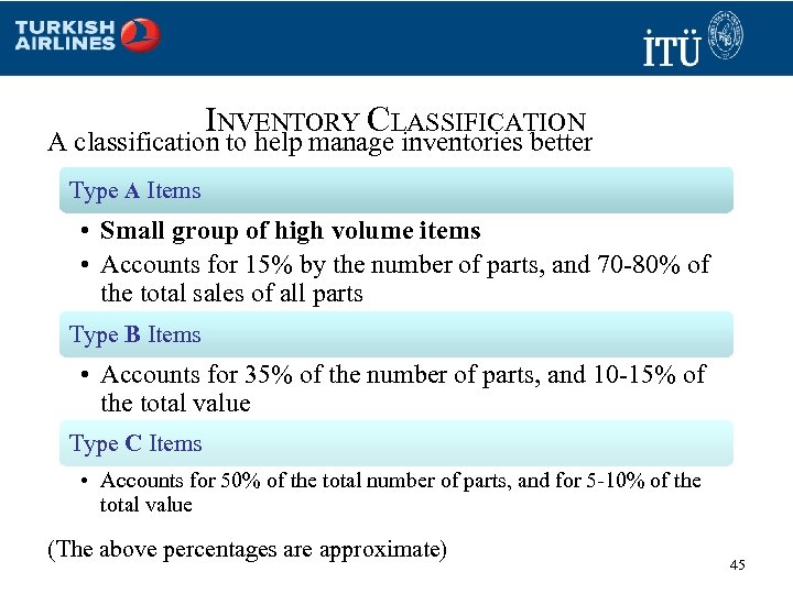 INVENTORY CLASSIFICATION A classification to help manage inventories better Type A Items • Small group of high volume items • Accounts for 15% by the number of parts, and 70 -80% of the total sales of all parts Type B Items • Accounts for 35% of the number of parts, and 10 -15% of the total value Type C Items • Accounts for 50% of the total number of parts, and for 5 -10% of the total value (The above percentages are approximate) 45