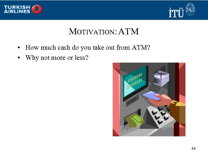 MOTIVATION: ATM • How much cash do you take out from ATM? • Why not more or less? 46