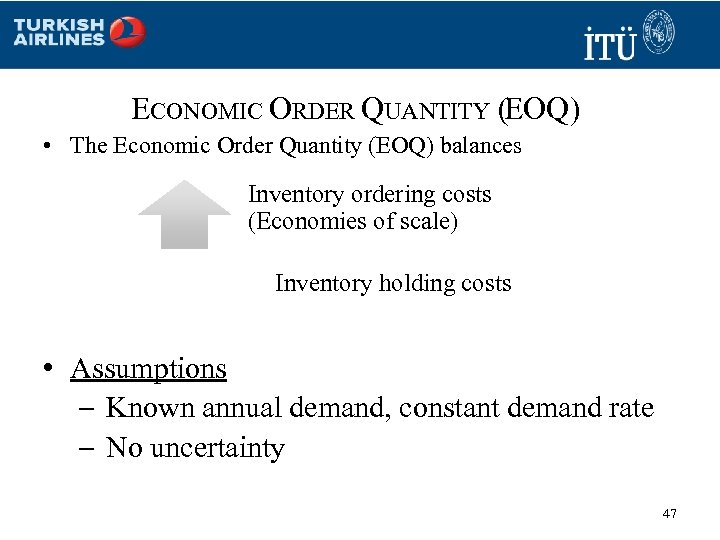 ECONOMIC ORDER QUANTITY (EOQ) • The Economic Order Quantity (EOQ) balances Inventory ordering costs (Economies of scale) Inventory holding costs • Assumptions – Known annual demand, constant demand rate – No uncertainty 47