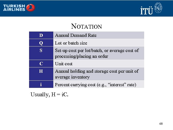 NOTATION D Annual Demand Rate Q Lot or batch size S Set-up cost per lot/batch, or average cost of processing/placing an order C Unit cost H Annual holding and storage cost per unit of average inventory i Percent carrying cost (e. g. , “interest” rate) Usually, H = i. C. 48