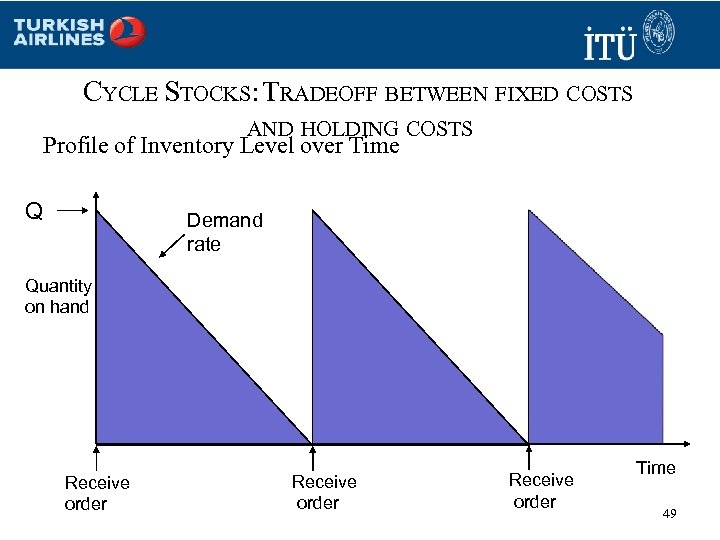 CYCLE STOCKS: TRADEOFF BETWEEN FIXED COSTS AND HOLDING COSTS Profile of Inventory Level over Time Q Demand rate Quantity on hand Receive order Time 49