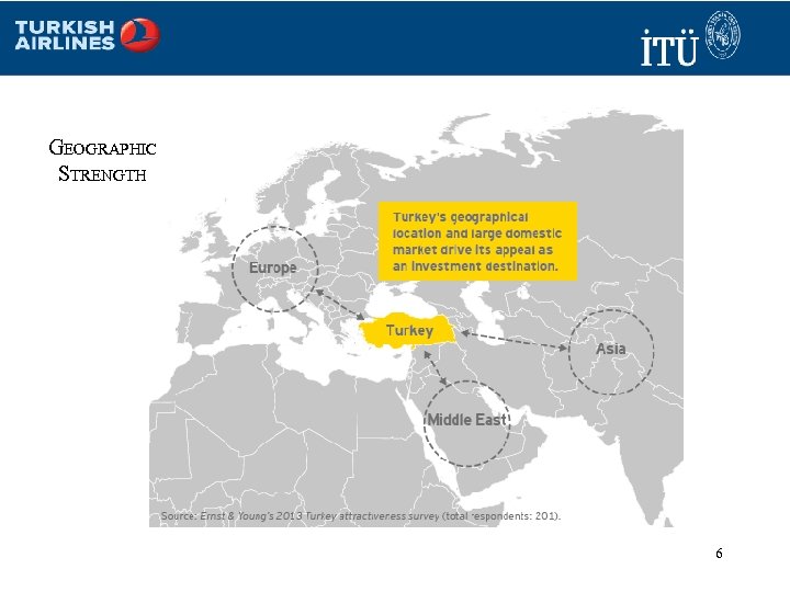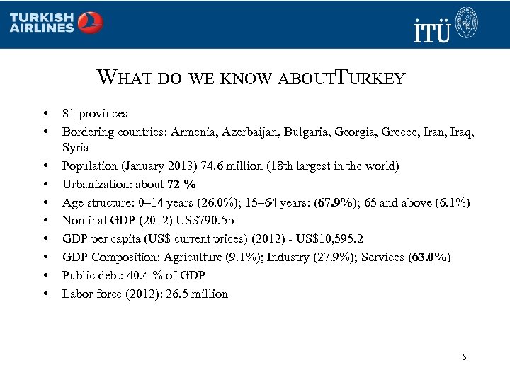 WHAT DO WE KNOW ABOUTTURKEY • • • 81 provinces Bordering countries: Armenia, Azerbaijan, Bulgaria, Georgia, Greece, Iran, Iraq, Syria Population (January 2013) 74. 6 million (18 th largest in the world) Urbanization: about 72 % Age structure: 0– 14 years (26. 0%); 15– 64 years: (67. 9%); 65 and above (6. 1%) Nominal GDP (2012) US$790. 5 b GDP per capita (US$ current prices) (2012) - US$10, 595. 2 GDP Composition: Agriculture (9. 1%); Industry (27. 9%); Services (63. 0%) Public debt: 40. 4 % of GDP Labor force (2012): 26. 5 million 5
