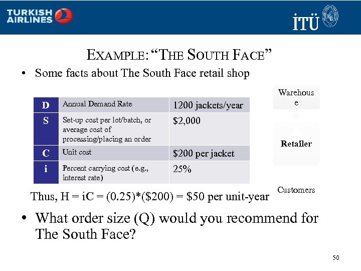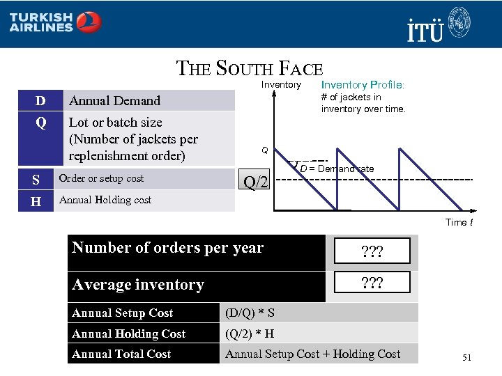 EXAMPLE: “THE SOUTH FACE” • Some facts about The South Face retail shop D Annual Demand Rate 1200 jackets/year S Set-up cost per lot/batch, or average cost of processing/placing an order $2, 000 C Unit cost $200 per jacket i Percent carrying cost (e. g. , interest rate) Warehous e 25% Thus, H = i. C = (0. 25)*($200) = $50 per unit-year Retailer Customers • What order size (Q) would you recommend for The South Face? 50