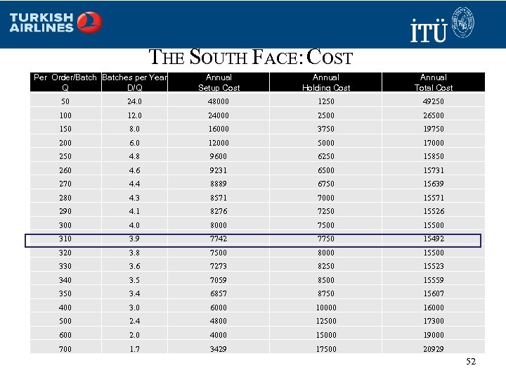 THE SOUTH FACE Inventory D Lot or batch size (Number of jackets per replenishment order) # of jackets in inventory over time. Annual Demand Q S Order or setup cost H Inventory Profile: Q D = Demand rate Annual Holding cost Q/2 Time t Number of orders per year D/Q ? ? ? Average inventory ? ? ? Q/2 Annual Setup Cost (D/Q) * S Annual Holding Cost (Q/2) * H Annual Total Cost Annual Setup Cost + Holding Cost 51
