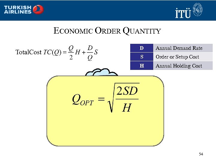 ECONOMIC ORDER QUANTITY D Annual Demand Rate S Order or Setup Cost H Annual Holding Cost 54
