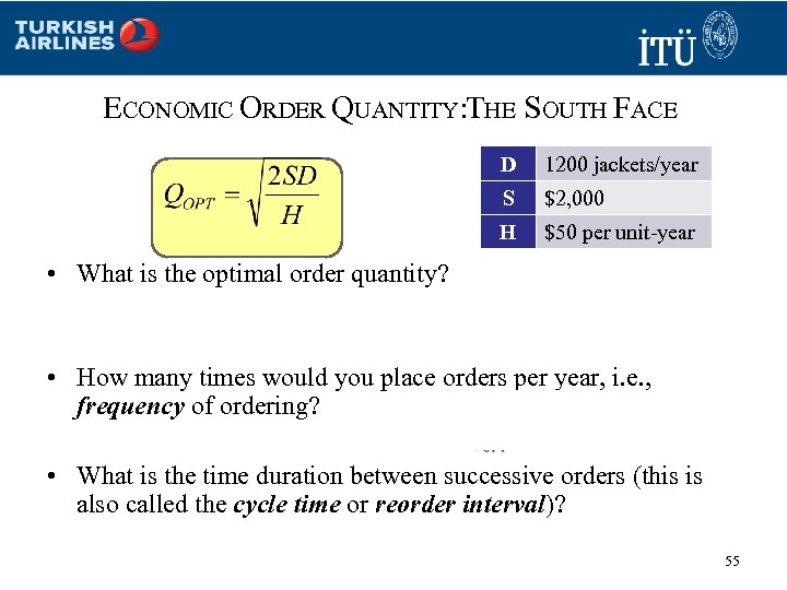 ECONOMIC ORDER QUANTITY: THE SOUTH FACE D 1200 jackets/year S $2, 000 H $50 per unit-year • What is the optimal order quantity? • How many times would you place orders per year, i. e. , frequency of ordering? • What is the time duration between successive orders (this is also called the cycle time or reorder interval)? 55