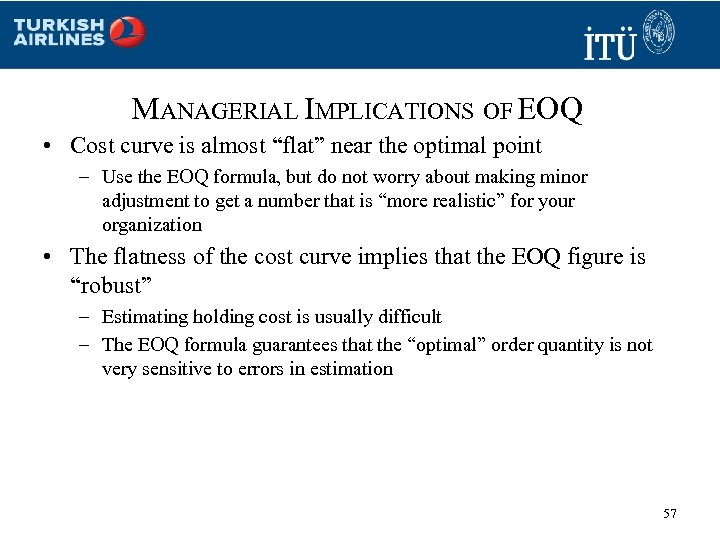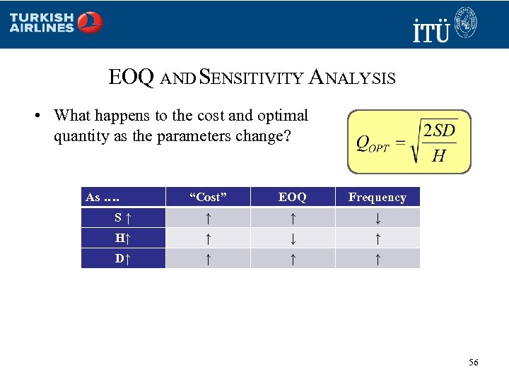 EOQ AND SENSITIVITY ANALYSIS • What happens to the cost and optimal quantity as the parameters change? As …. “Cost” EOQ Frequency S↑ ↑ ↑ ↓ H↑ ↑ ↓ ↑ D↑ ↑ 56