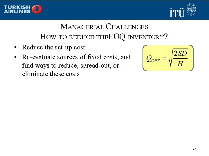 MANAGERIAL CHALLENGES HOW TO ESTIMATE COSTS? Ordering/Setup Costs (Fixed Costs): S • Estimate costs incurred during the start of each new order • Do not count “sunk” costs and fixed overhead Unit Cost: C • Estimate variable cost incurred in the production of each additional unit Holding or Carrying Costs (as % of unit cost): i • Estimate opportunity cost of working capital • Estimate cost of storage, handling, etc 58